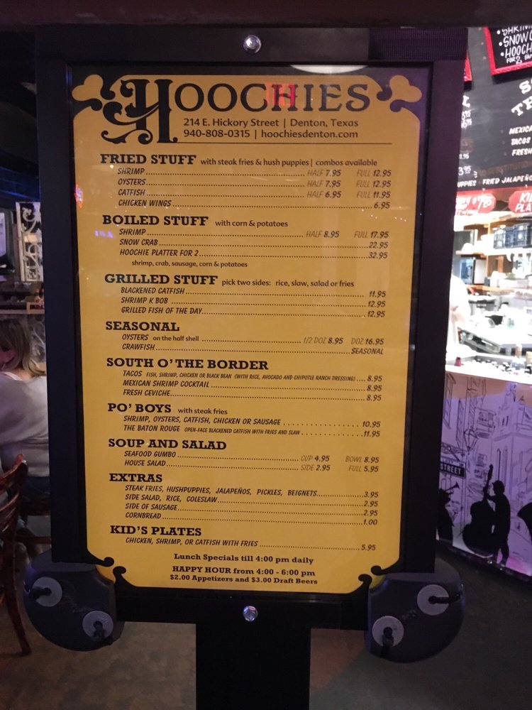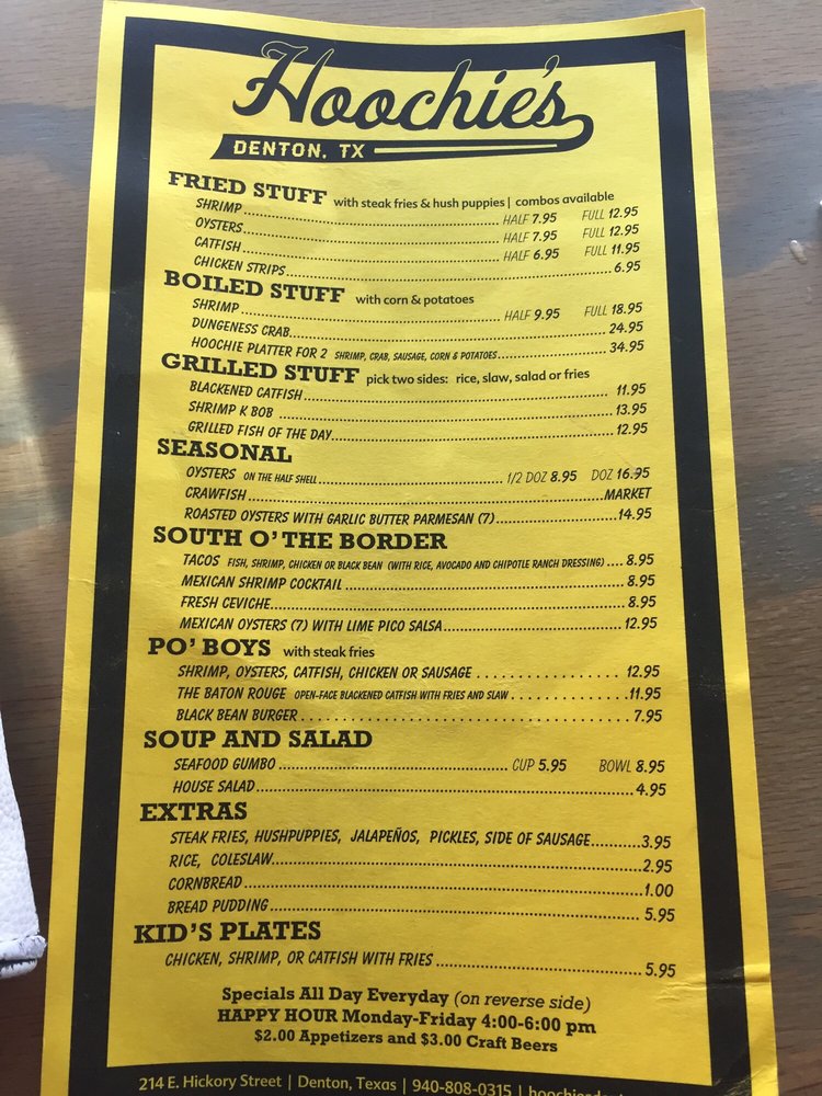 Hoochies, a Cajun/Creole seafood gem in Denton, TX, offers a delightful dining experience. With a wide range of vegetarian options and excellent service, this casual restaurant is perfect for lunch or dinner. The menu features favorites like fried shrimp, grilled catfish, hush puppies, gumbo, and shrimp cocktail that have left customers raving. The generous portions and friendly staff create a welcoming atmosphere, perfect for both group gatherings and quiet meals. Situated near Denton's historic square, Hoochies is a must-visit for seafood lovers craving authentic Creole flavors. Specialties like Creole shrimp and oysters paired with New Orleans beers enhance the dining experience. Whether dining in or taking out, Hoochies promises a satisfying meal that will keep you coming back for more.
